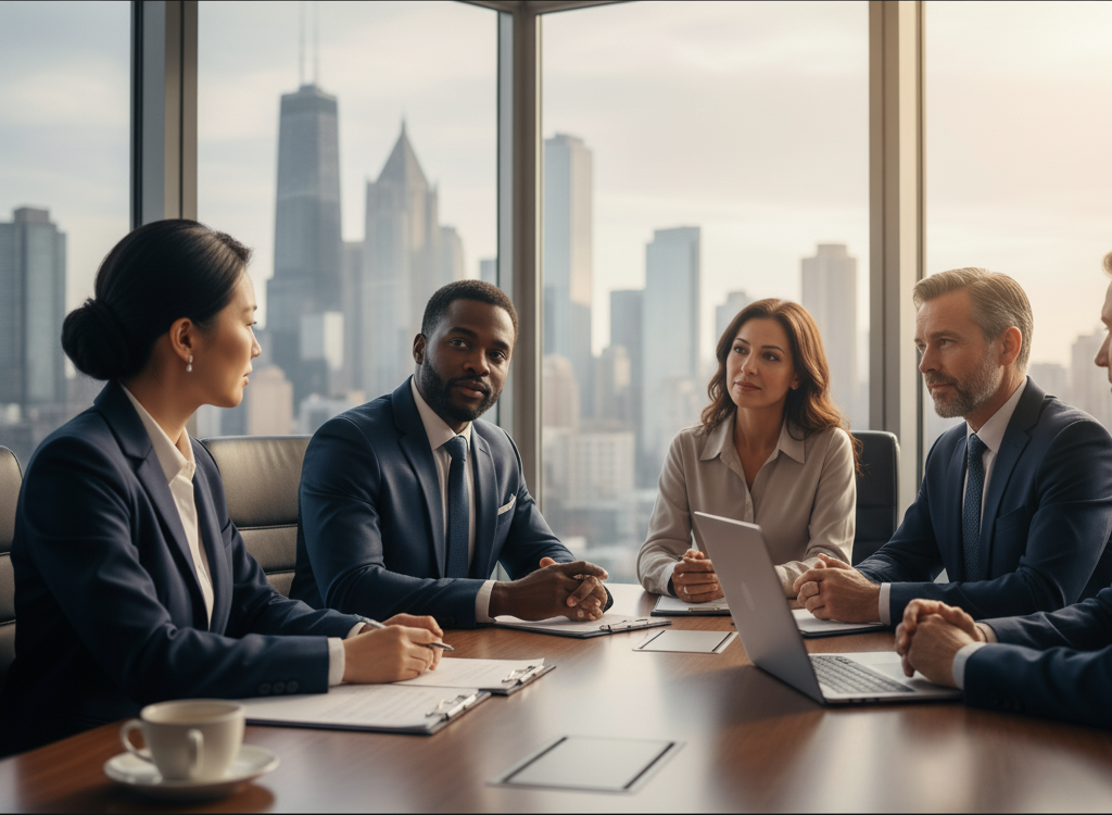 Business meeting with five professionally dressed people seated at a conference table in a high-rise office, with a city skyline in the background.